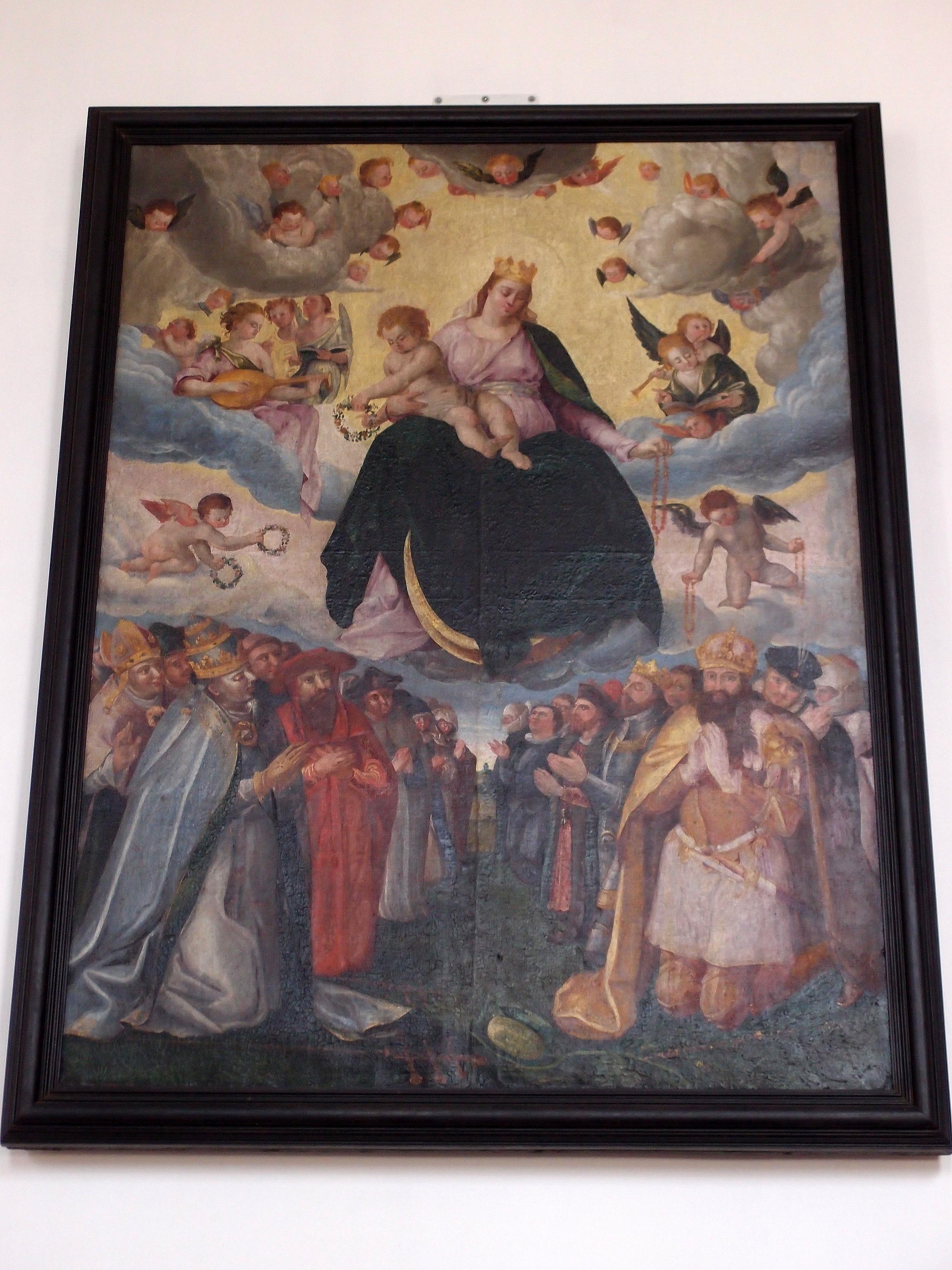 Das bedeutendste Ausstattungsstück ist das heute auf der linken Seite angebrachte ehemalige Altarblatt aus der ersten Hälfte des 17. Jahrhunderts. Es zeigt, wie die Muttergottes mit dem Jesuskind den geistlichen und den weltlichen Ständen den Rosenkranz reicht.