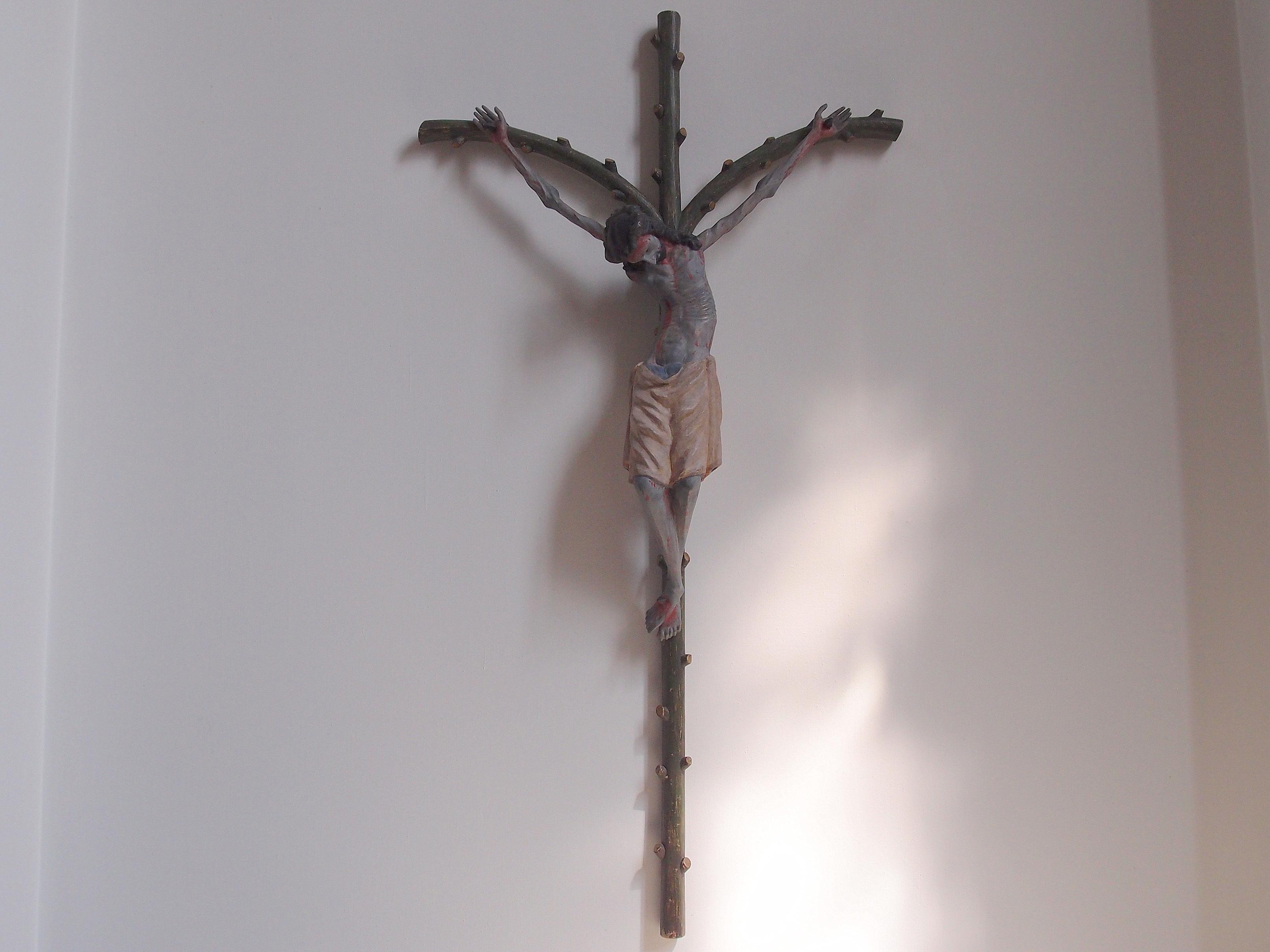 Lediglich als Kopie ist das bedeutendste Ausstattungsstück der Kirche über dem rechten Seitenaltar zu sehen; das wertvolle Original befindet sich seit einigen Jahres im Museum Burg Zug: Die ausdrucksstarke Skulptur des Gekreuzigten (auf ergänztem Astkreuz) datiert aus dem späten 13. Jahrhundert, aus der Blütezeit der mittelalterlichen Mystik.
