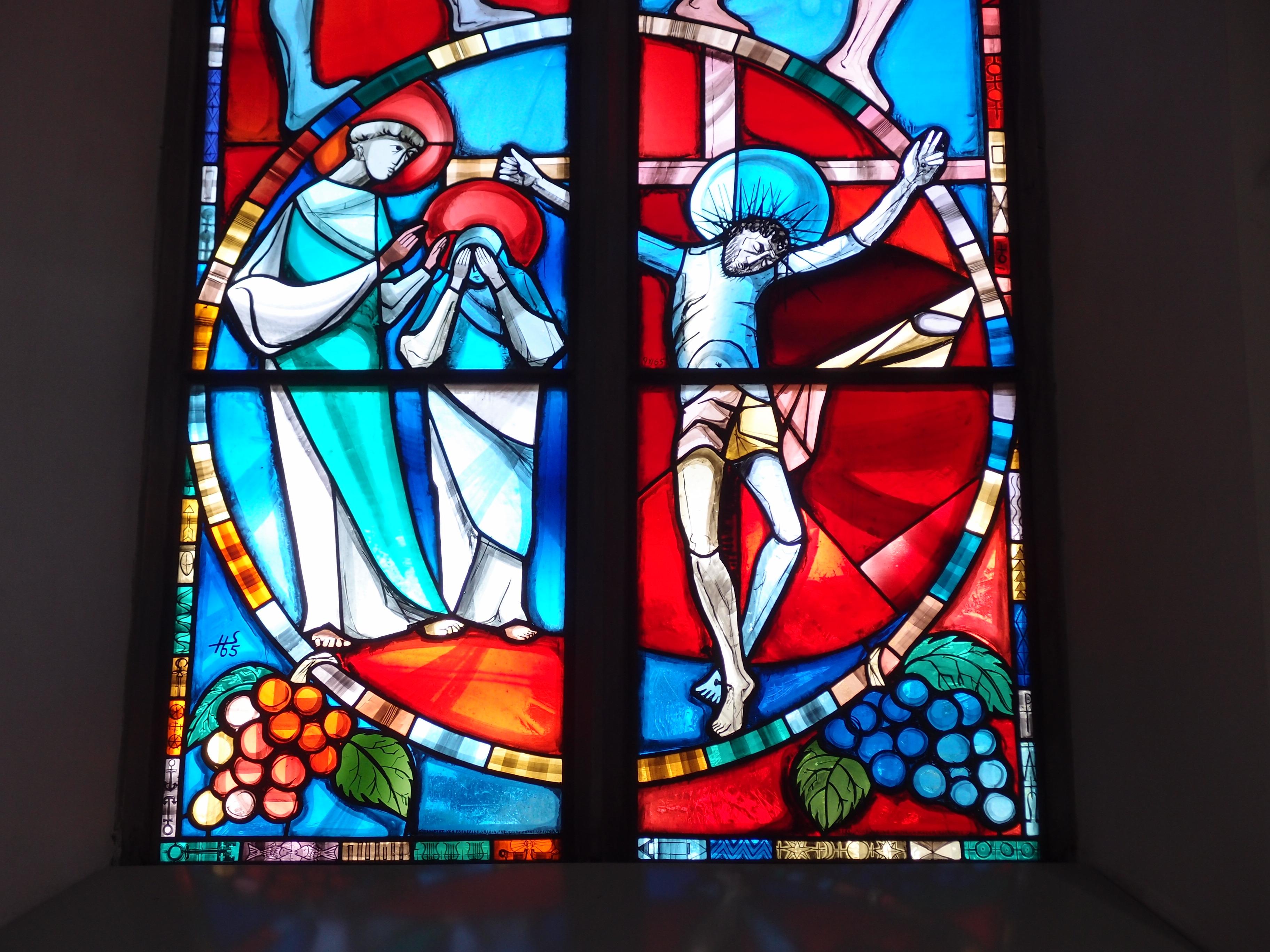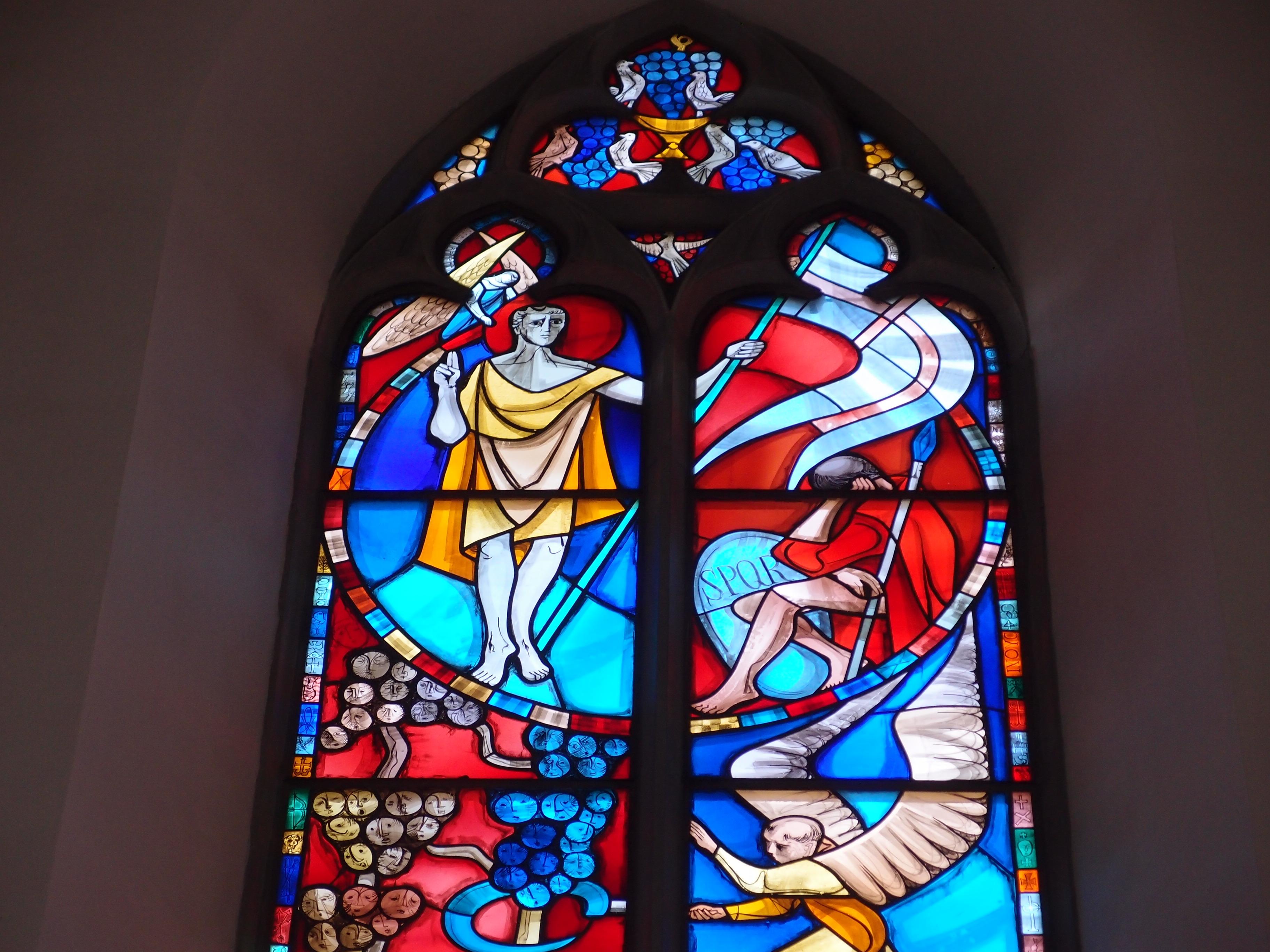 Im heute schlichten Kirchenraum bilden die drei hohen Chorfenster von Hans Schilter den einzigen farbigen Schwerpunkt.